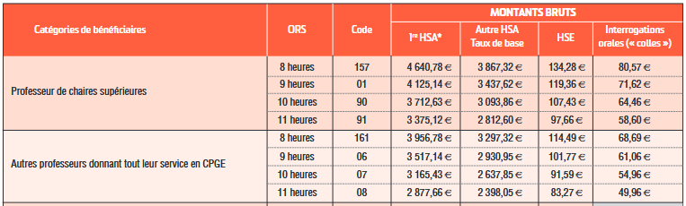 Si l’échelonnement indiciaire est identique à celui des agrégés, en revanche le taux de rémunération des heures supplémentaires années (HSA), heures effectives et heures d’interrogations orales des professeurs chaires supérieures est plus élevé.