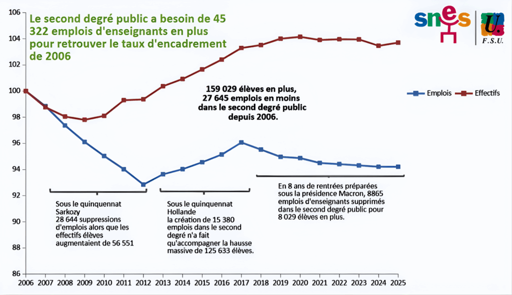 En 8 ans de rentrée préparées par Emmanuel Macron, le nombre d’élèves a augmenté dans les collèges et les lycées (+8865). Dans le même temps, les ministres successifs ont supprimé 8029 emplois de professeurs dans le 2nd degré. L’argument démographique a bon dos, il est surtout un prétexte à légitimer encore des suppressions d’emplois !