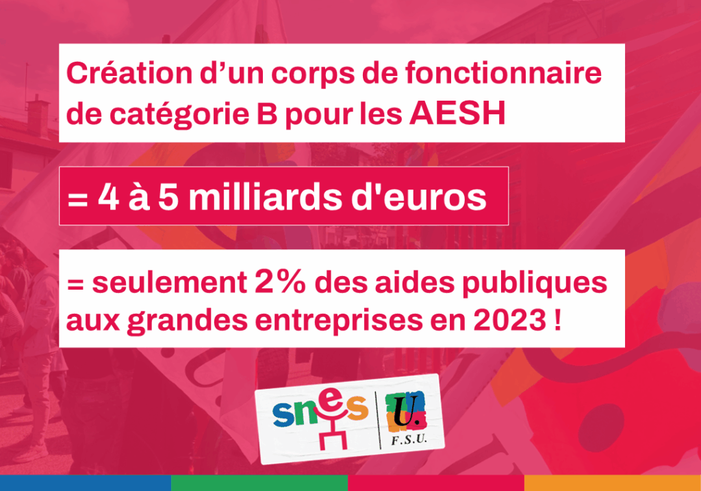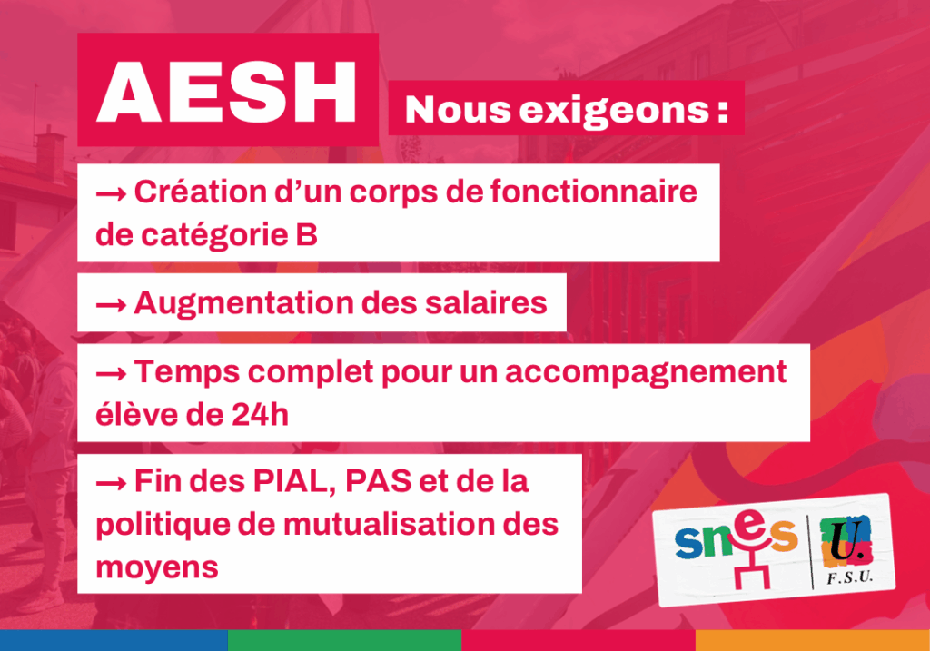 Pour sortir de cette précarité pérennisée depuis 25 ans, le SNES avec la FSU exigent pour les accompagnant·es d’élèves en situation de handicap la création d’un statut de fonctionnaire de catégorie B, avec un temps complet à 24h. Un statut pour les accompagnant·es sera une première étape vers une école inclusive respectueuse des personnels et des élèves.