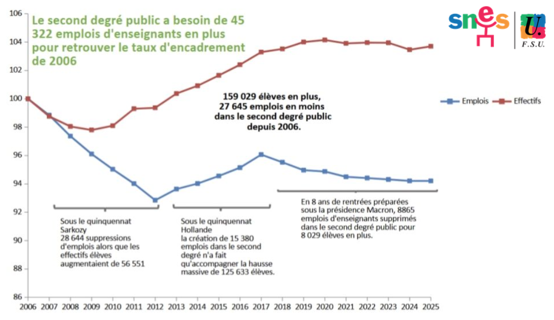 Un regard quelques années en arrière invalide complètement ce raisonnement : sur les 8 précédentes rentrées préparées sous Emmanuel Macron, 8 865 emplois d’enseignant·es ont été supprimés dans le second degré public alors même que 8 029 élèves supplémentaires étaient accueillis dans les collèges et lycées publics. Pour retrouver le taux d’encadrement de 2017, il faudrait créer 10 617 emplois. En remontant plus loin, le second degré public a été la grande victime, en termes d’emplois et de réformes, des politiques publiques depuis 2006. Ses effectifs élèves ont augmenté de 4 % pendant que les emplois baissaient de 6 %. Quand les effectifs augmentaient, les macronistes ne voulaient pas entendre parler de l’argument démographique et maintenant qu’ils baissent, les mêmes se ruent sur les chiffres de la démographie pour tenter de légitimer les suppressions d’emplois. Inacceptable !