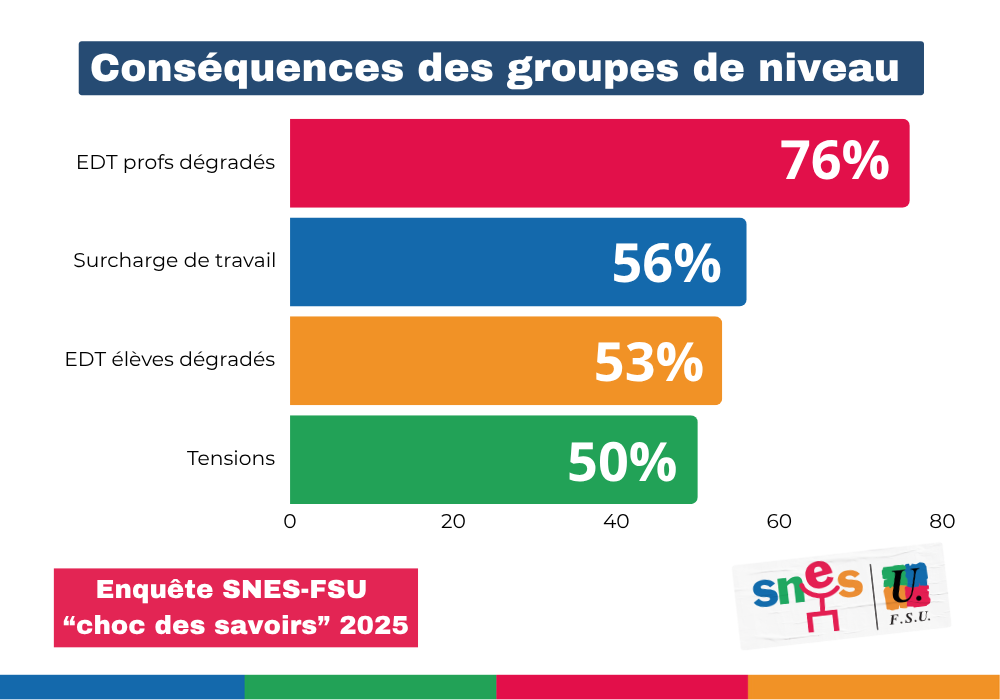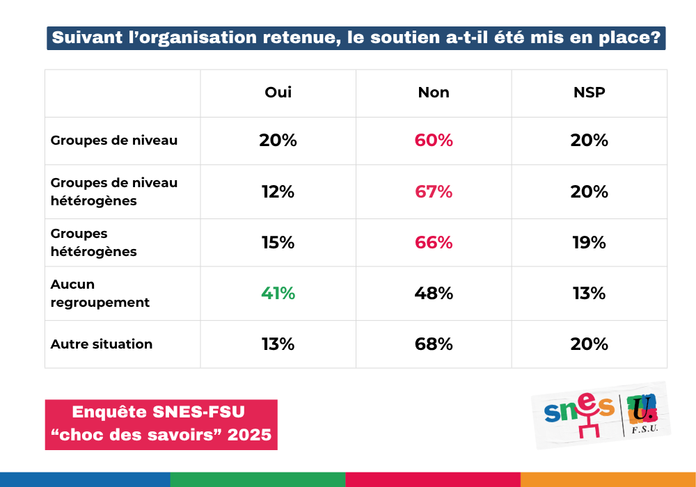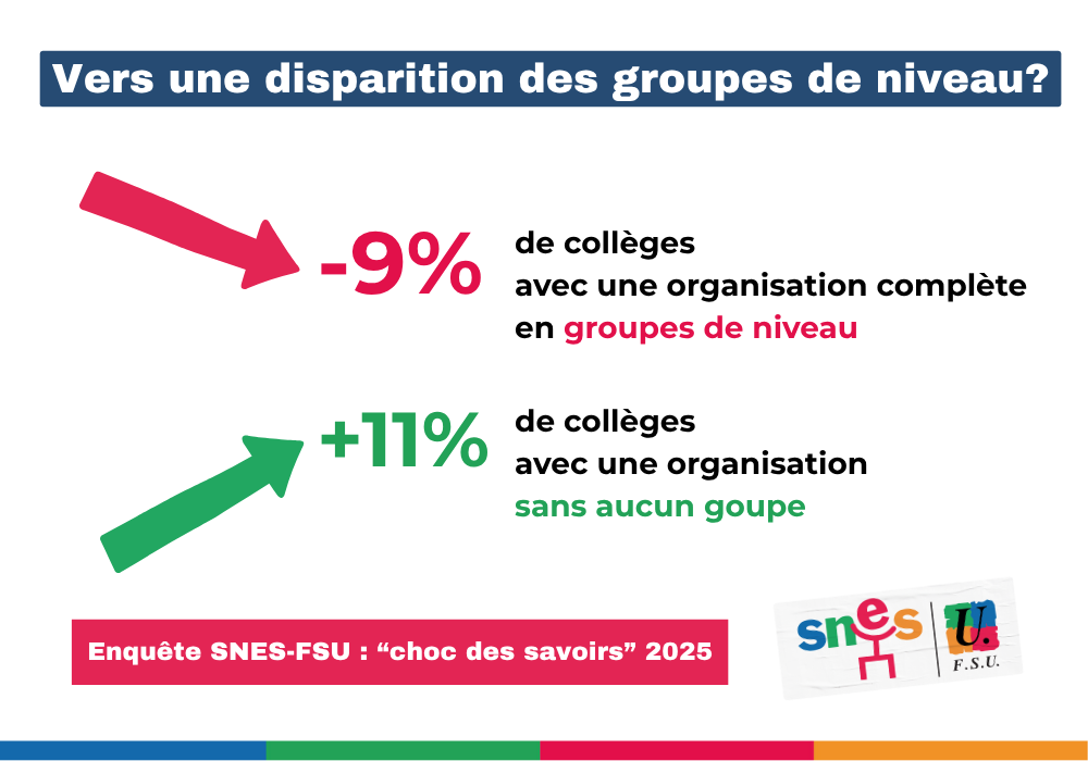 La mobilisation de la profession avec le SNES-FSU ont permis que les regroupements de niveau ne soient pas généralisés à la rentrée 2025 en Quatrième et Troisième. Le ministère a transformé ce dispositif en « renforcement » dans son décret de 2025. Le renforcement n’existe pas dans 48 à 66 % des collèges interrogés. La modalité la plus fréquente quand il est mis en place est sous forme d’heures de soutien à des élèves en difficulté (de 8 à 18 % selon l’organisation des enseignements).