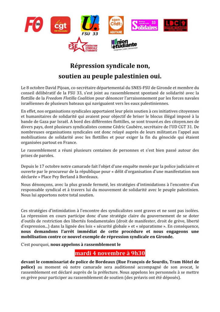 Le SNES-FSU Bordeaux a pris connaissance d’une procédure policière qui vise David Pijoan, militant du SNES dans notre académie. Il doit être entendu le mardi 4 novembre par la police suite à une manifestation de soutien à la flottille pour Gaza, le 8 octobre, dont l’appel avait été relayé par des collectifs de soutien à la cause palestinienne.