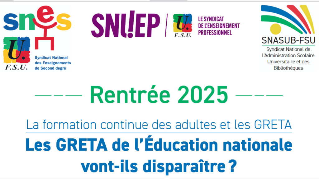 La FSU et ses syndicats par champs de syndicalisation SNES, SNUEP, SNASUB ou SNUIPP sont très attentifs aux situations des agents des GRETA. La FSU et ses militants revendiquent une harmonisation par le haut sur tout le territoire et la transparence dans la gestion des agents.