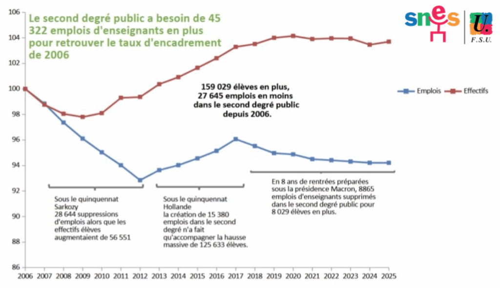 Le SNES-FSU rappelle qu’il faudrait la création de 10017 emplois pour « simplement » retrouver le taux d’encadrement de 2017 dans les collèges et les lycées.