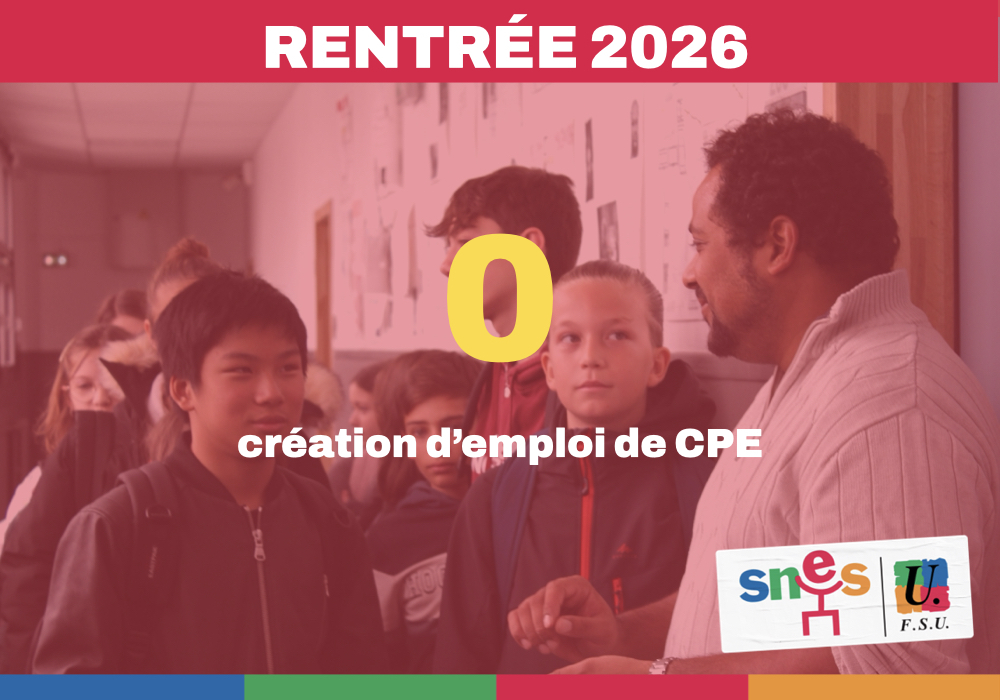 Les vies scolaires sont notoirement sous tension et pourtant, aucune création d’emplois de CPE. Le SNES a dénoncé cette situation, à rebours des grands discours sur le climat scolaire ou la lutte contre le harcèlement en milieu scolaire. La contradiction est flagrante entre les déclarations du ministre Edouard Geffray et la réalité sur le terrain. Le SNES-FSU a aussi exigé un bilan des emplois de CPE dits de tranquillité scolaire (plan d’Anne Genetet à l’automne 2024) dont certains ne sont pas implantés dans des établissements mais dans les rectorats pour des « brigades d’intervention » dans des établissements en crise.