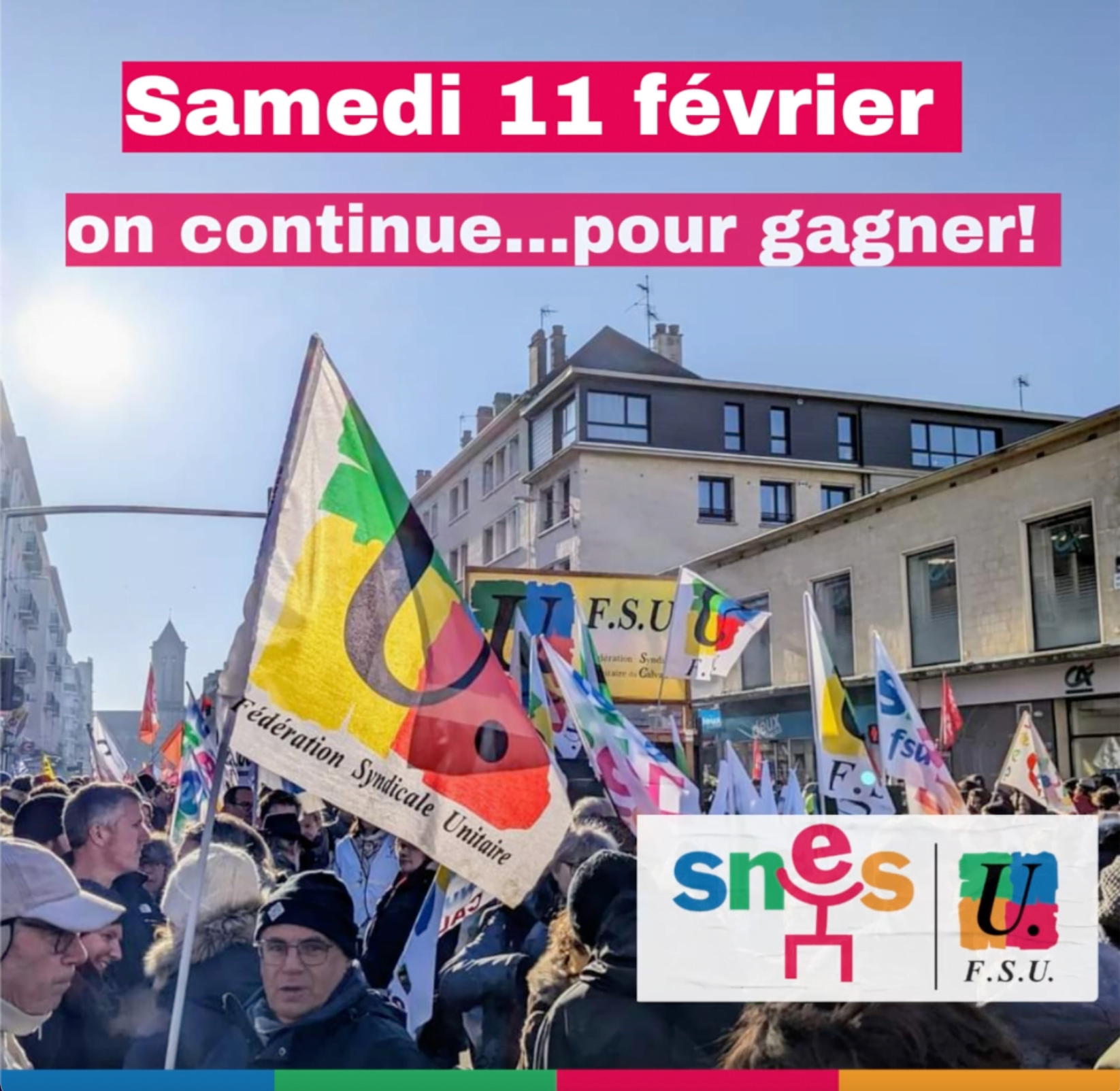 Depuis le 19 janvier, des millions de travailleurs et travailleuses, du public comme du privé, jeunes et retraité-es, se sont mobilisée-s, par la grève et/ou ont manifesté sur l’ensemble du territoire. Après trois journées d’action historique, le SNES avec la FSU et l’intersyndicale appellent à participer massivement aux rassemblements et manifestations organisés ce samedi 11 janvier (carte interactive à venir) et à poursuivre la mobilisation pour gagner le retrait de la réforme!